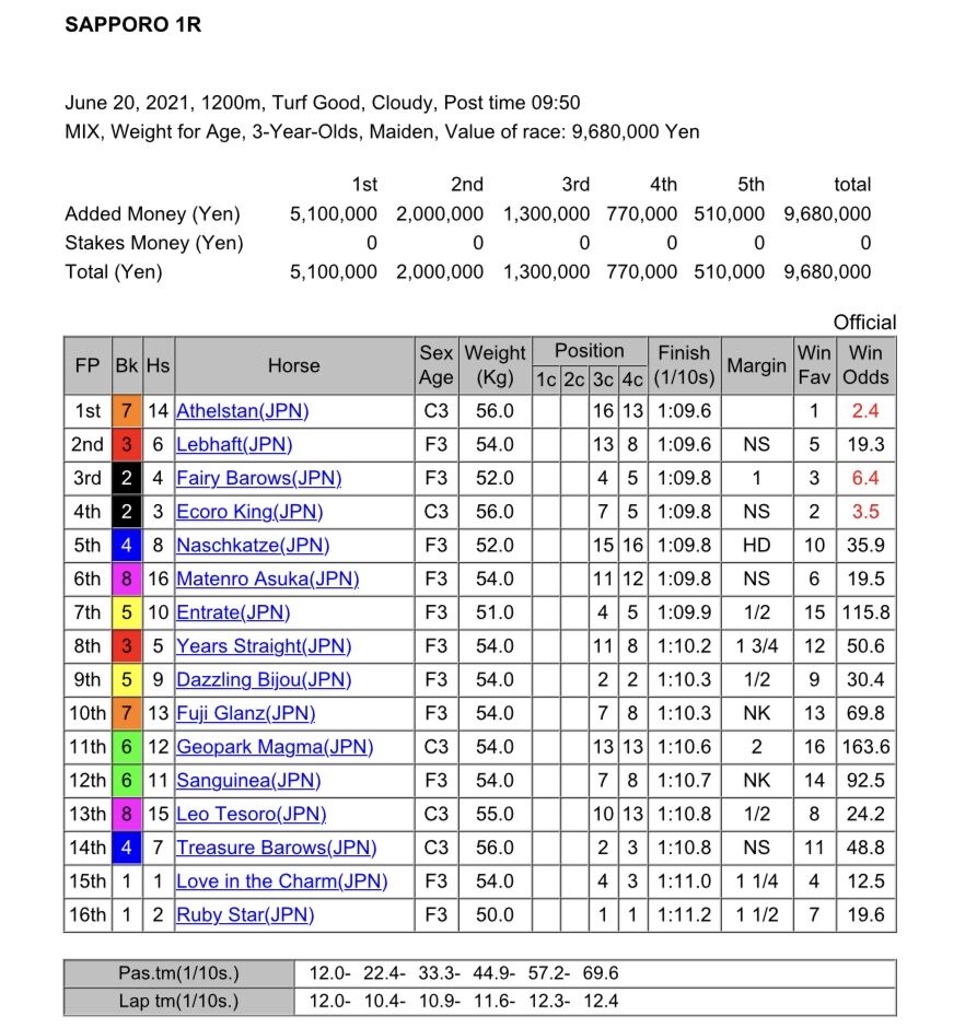 6/20/2021 Sapporo Race 1 Maiden 1200m (Turf)