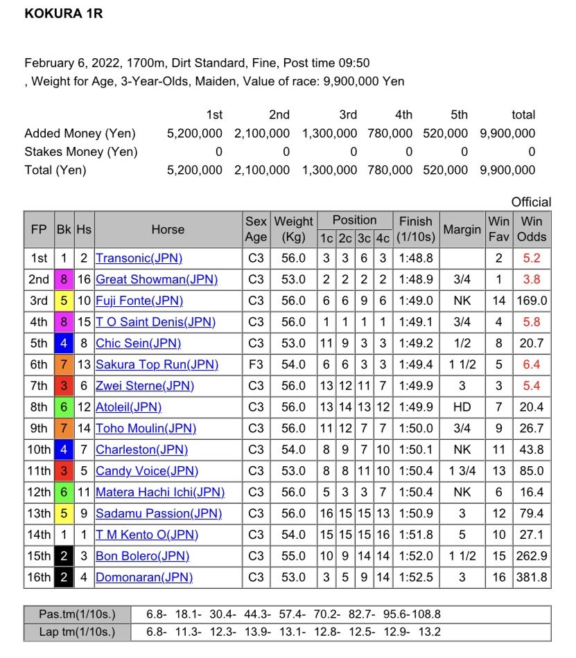 2/6/2022 Kokura Race 1 Maiden 1700m (Firt)