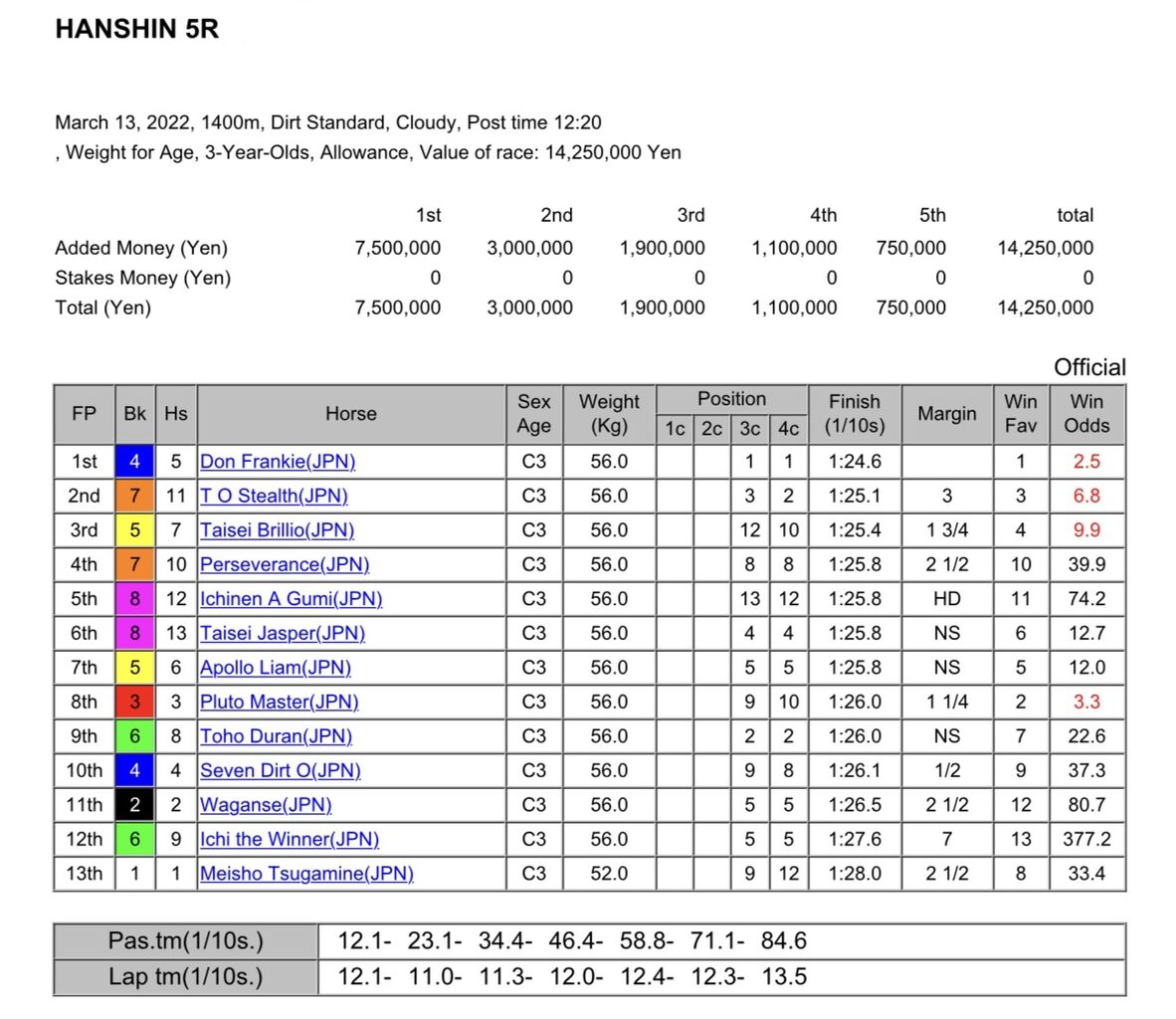3/13/2022 Hanshin Race 5 Weight For Age 1400m (Dirt)