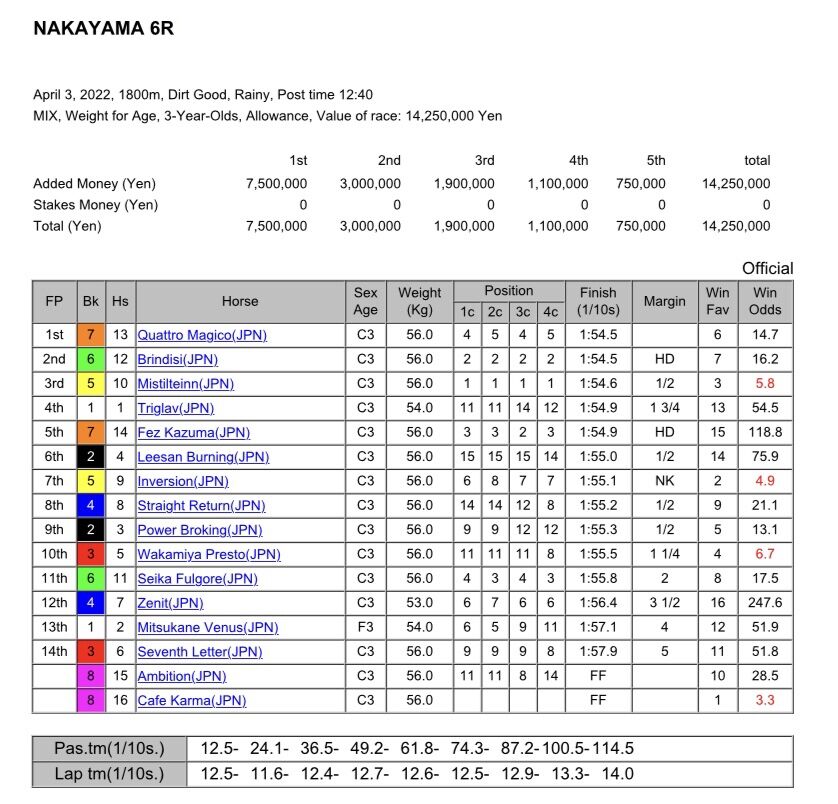 4/3/2022 Nakayama Race 6 Weight For Age 1800m (Dirt)