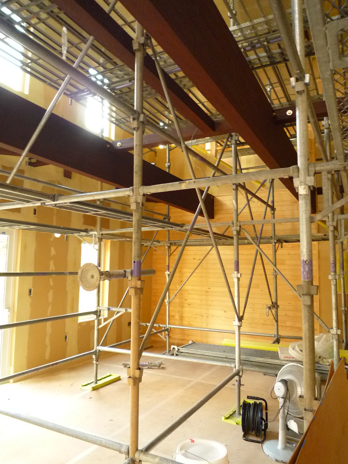 このように、吹抜け空間がある場合は内部にも足場を組み、仕上ていきます。
