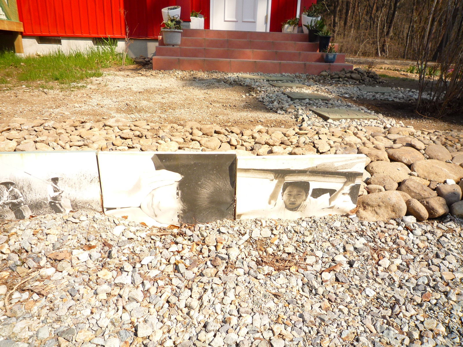 息子さんが元写真部だったそうで、その展示に使ったパネルを土止めに使っているとのこと。