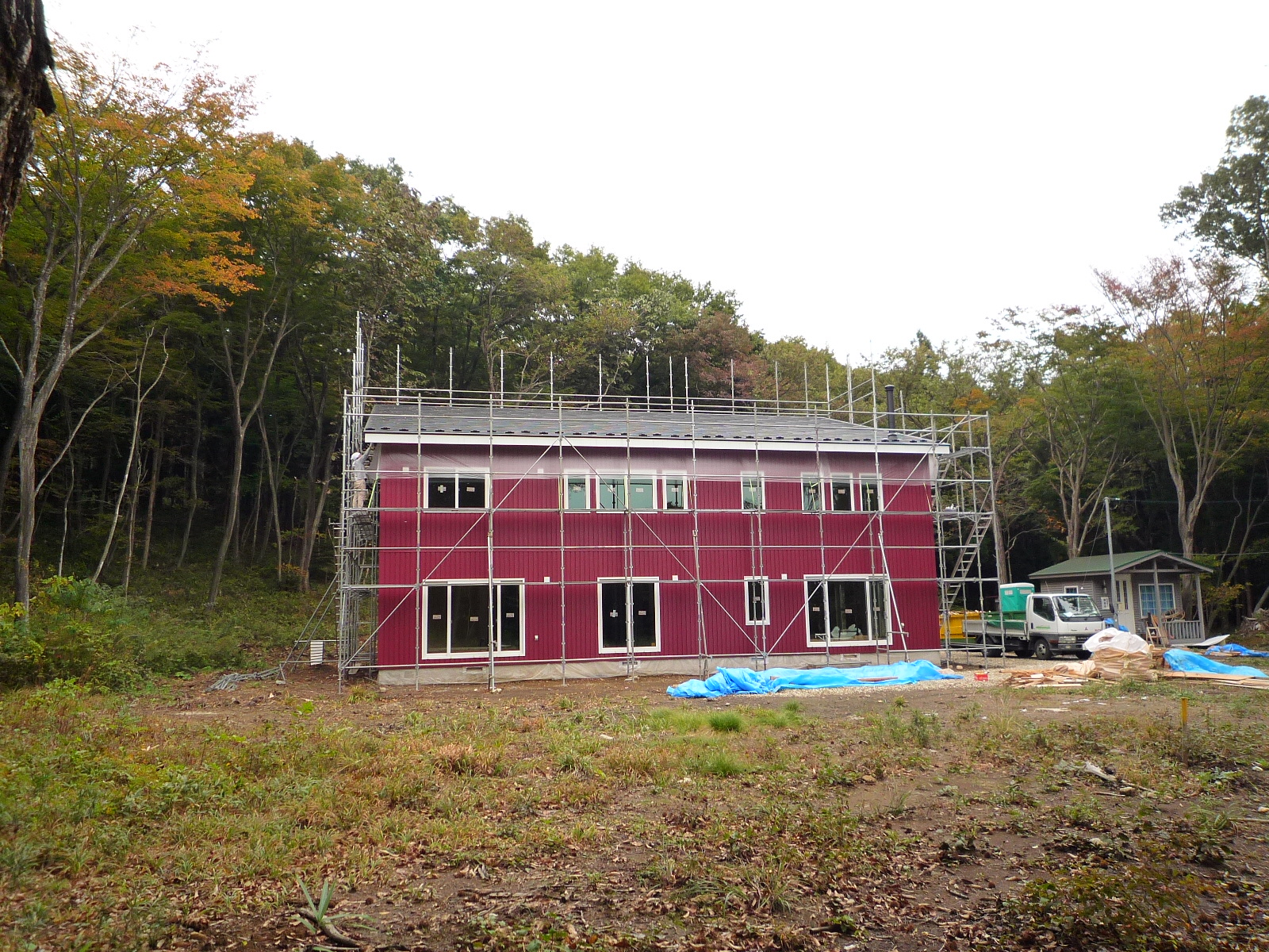 こだわりのエンジ色です。木々の緑と、冬は雪深い地域なので、雪に映える色ということでこの色を選ばれました。