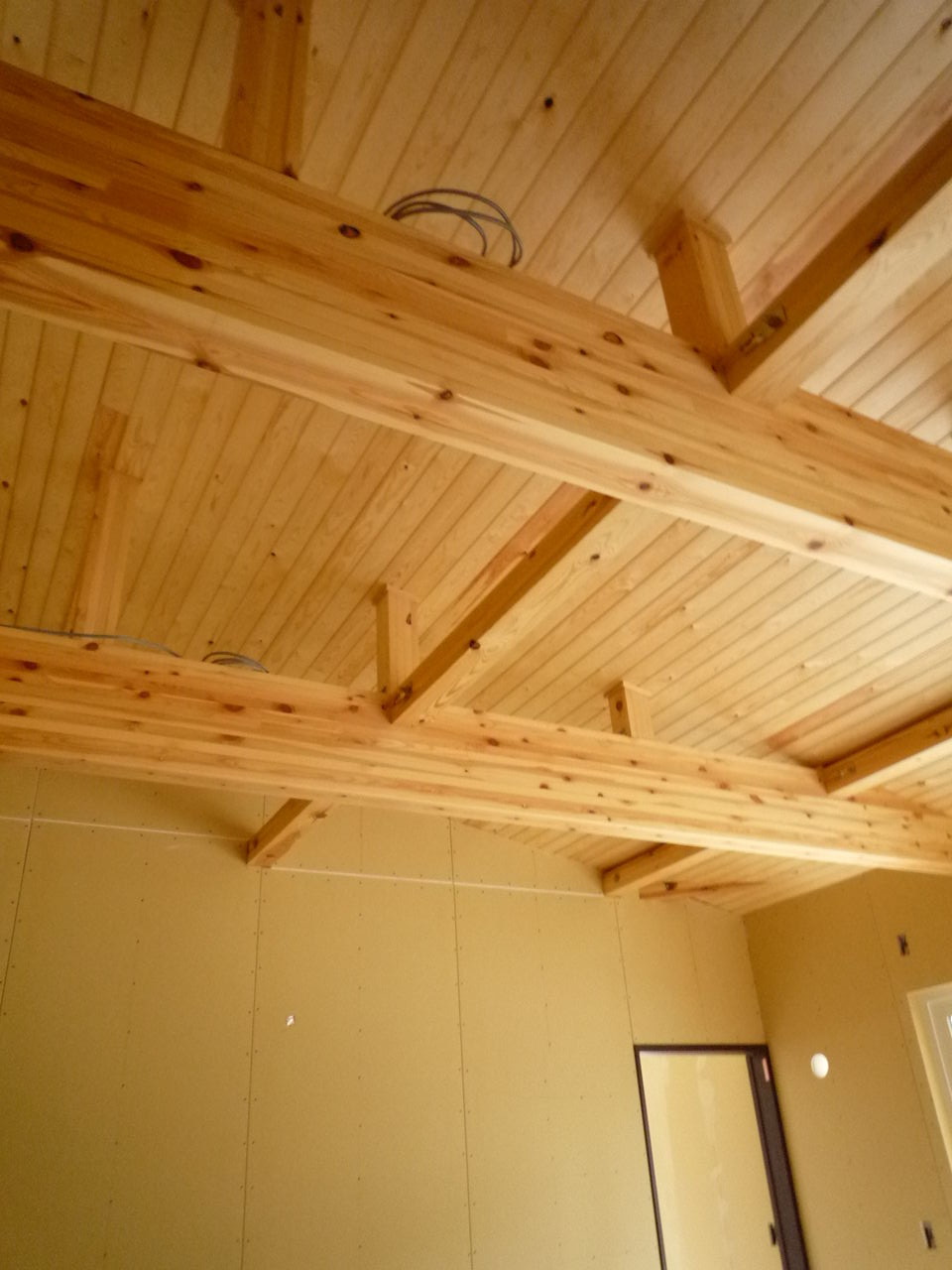 さて、写真は、Sさま邸で天井に使わせていただいているレッドパインの羽目板です。
