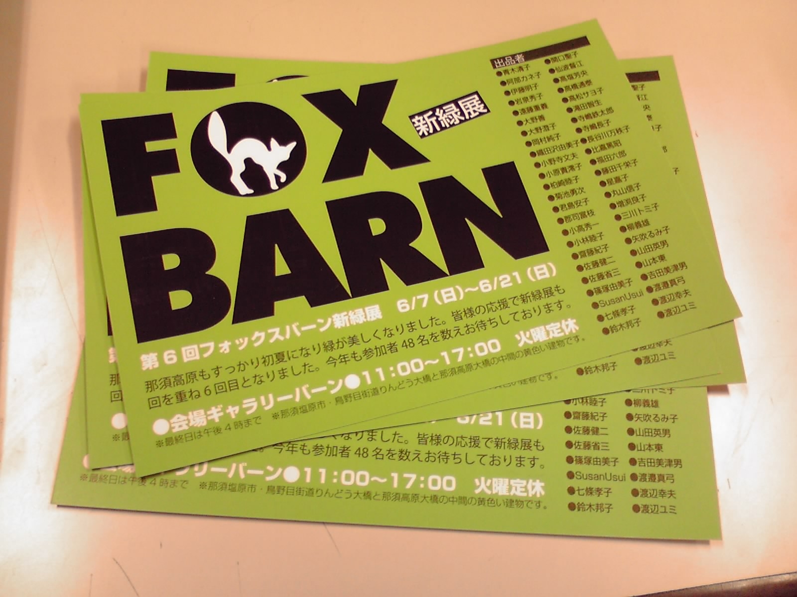 FOX BARN 新緑展こんにちは☆営業Yです。今日は午後からとても気持ちの良い天気でした。明日もこんな天気だと良いですね♪さて、明日は日曜日です。皆さま、お出かけの計画はされましたか??もし何も計画されていないのでしたら・・・ぜひこちらへお出かけください☆那須塩原市小結のギャラリー、「ギャラリーバーン」(http://gallerybarn.sblo.jp/)にて、地元のデッサン会の仲間で新緑展を開催いたします。総勢48名の力作、ぜひ見にいらしてくださいね。※ 私も一品出展しておりますよ~(*'-'*)