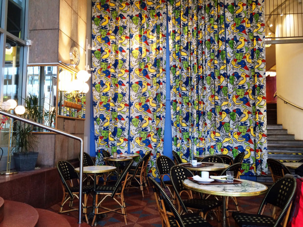圖:第二日上午早餐的咖啡廳。背景是一堵藍色的墻,再加artistic的落地帘和同色系的轉角樓梯。