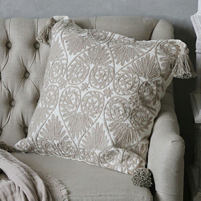 クッションカバー コットン エンブロイダリー タッセル 50x50cm CONDOR // 正方形 総柄 刺繍 ハンドメイド インド 天然素材 綿 クッション カバー ナチュラル ベージュ ホワイト アラベスク フリンジ ビーズ エスニック コンドール おしゃれ楽天市場