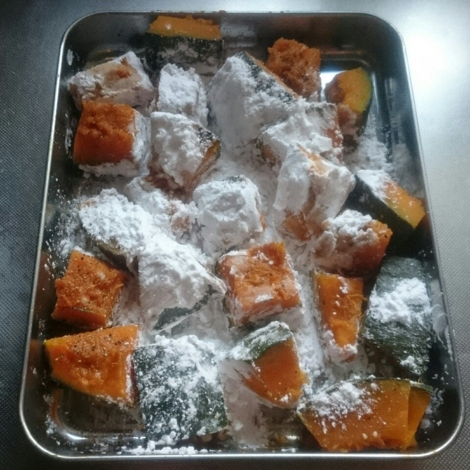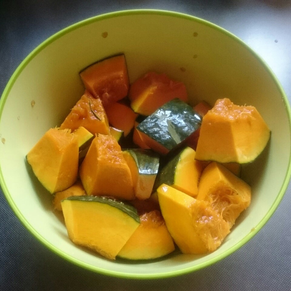 かぼちゃは適当に切り耐熱ボールに入れ醤油をまぶす。