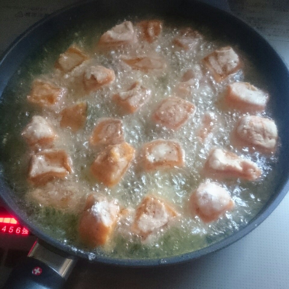 軽く水分を拭き取り、塩コショウと片栗粉をまぶす。