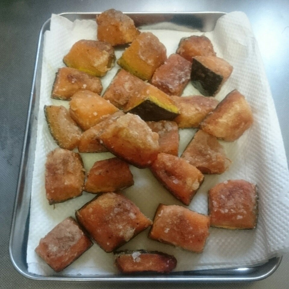 03フライパンの底から1cmぐらいの深さの油をしいて中火にかけたら、片栗粉をまぶしたかぼちゃを皮を下にして並べる。