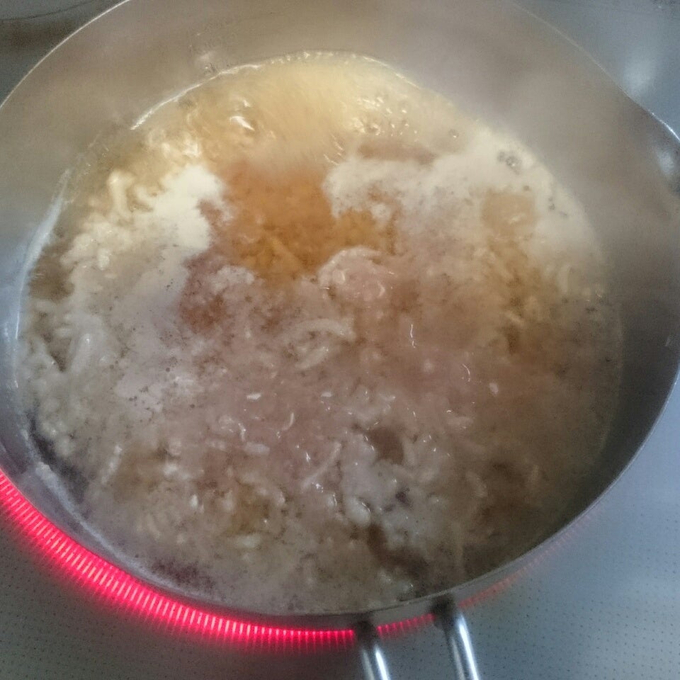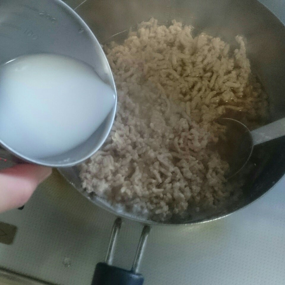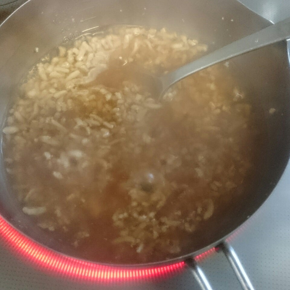 06沸騰したら鶏ひき肉を1度に入れ、ほぐしながら煮ていく。