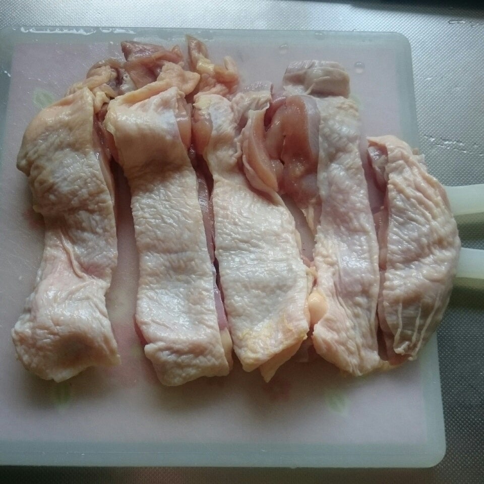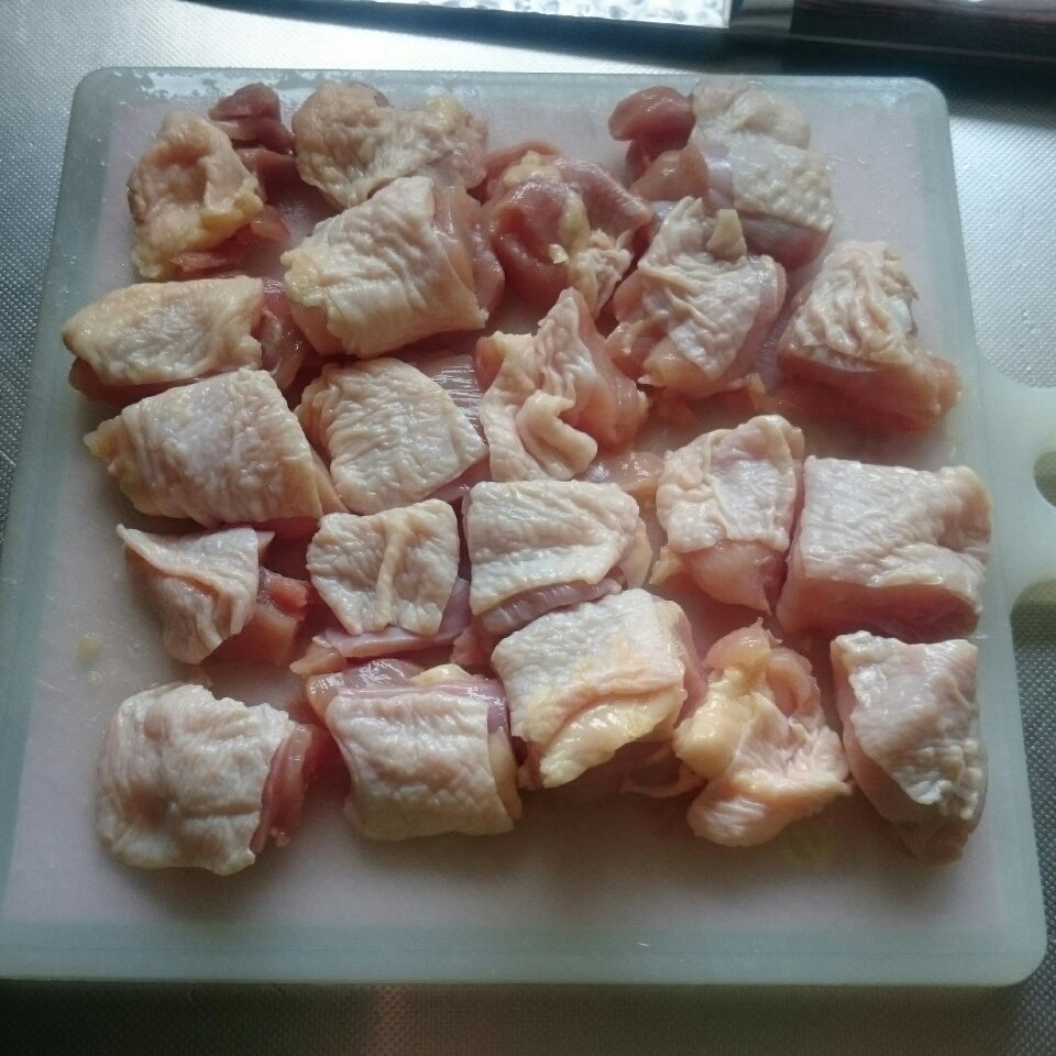 鶏肉は余分な筋や脂肪を切り取り立てに5等分ぐらいに切る。