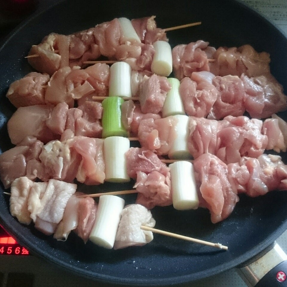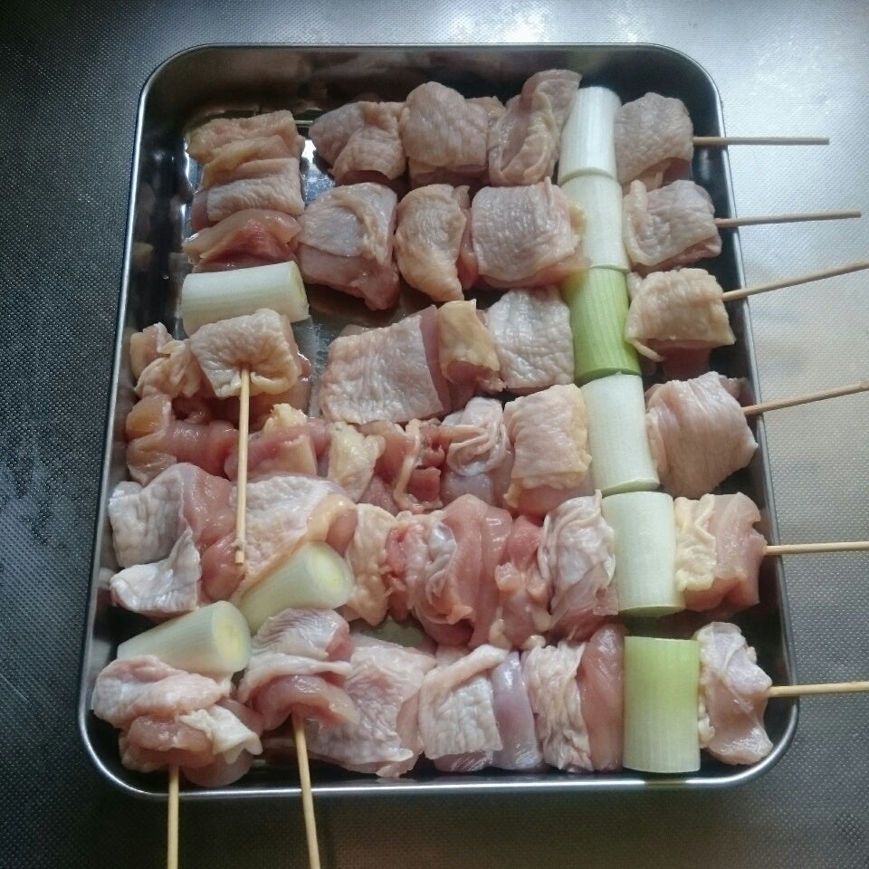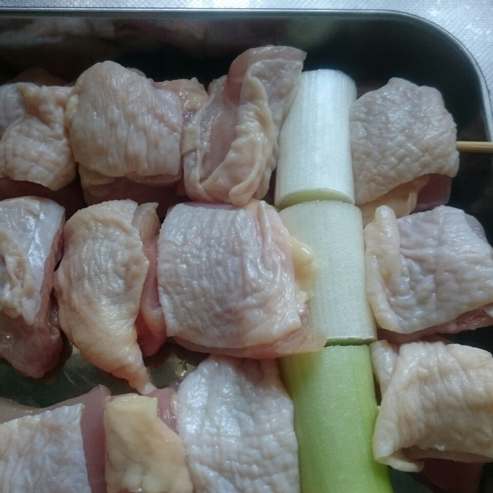 竹串に小さめの鶏肉➡長ねぎ➡鶏肉を3個の順に刺し、形を整える。