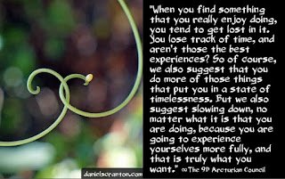 今、一般的に言って、あなたが本当に楽しんでいる何かを見つけたとき、あなたはそれに没頭する傾向があります。あなたは時間を見失っています。それは最高の経験ではありませんか? ですからもちろん、あなたを時間のない状態に置くような物事をより多くするようオススメします。しかし、あなたがしていることが何であれ、減速することをお勧めします。なぜなら、あなたは自分自身をより完全に経験することになり、それが本当にあなたが望むことなのです。