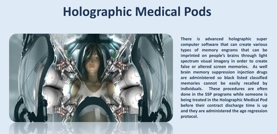 さまざまなタイプのメモリエングラムを作成できる高度なホログラフィック・スーパーコンピュータソフトウェアがあり、光スペクトルの視覚的画像を通じて人々の脳に刻印して、誤ったまたは変更された画面メモリを作成できます。 脳の記憶抑制注射薬が投与されるだけでなく、ブラックリストに分類された記憶を個人が簡単に思い出すこともできません。 これらの手順は、誰かがホログラフィック・メディカル・ポッドで治療中の契約退院時間が終了する前にSSPプログラムで行われ、年齢回帰プロトコルが実行されます。