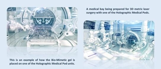 (左の写真)これは、バイオ・ミメティック・ゲル をホログラフィック ・医療•ポッド・ユニットの1つに配置する方法の例です。