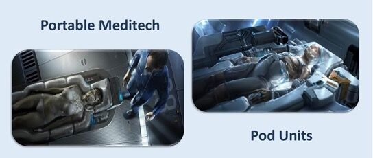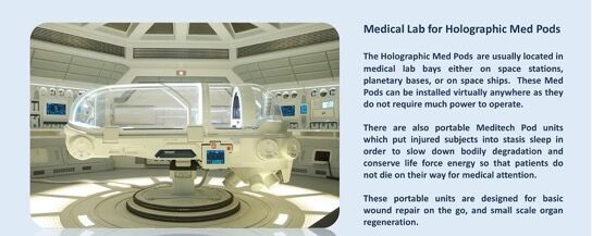 負傷した被験者をうっ血させて寝かせるポータブル・メディテック・ポッド・ユニットもあり、身体の劣化を遅らせ、生命力エネルギーを節約して、患者が治療のために途中で死亡しないようにします。 これらのポータブル・ユニットは、外出先での基本的な創傷修復、および小規模臓器再生用に設計されています。