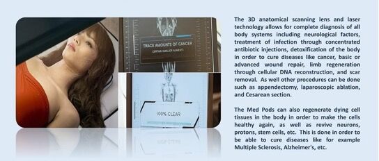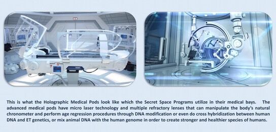 高度な医療ポッドには、マイクロレーザー技術と複数の耐火レンズがあり、身体の自然なクロノメーターを操作し、DNA変更を通じて年齢回帰手順を実行したり、人間のDNAとET遺伝学の間でクロスハイブリダイゼーションを行ったり、動物のDNAを人間のゲノムと混合して人間のより健康な種の強力なものを作成したりできます 。