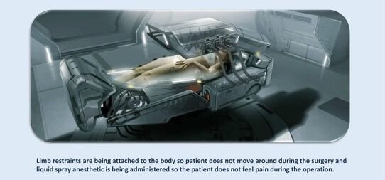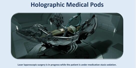 ホログラフィック医療ポッドは自動化された医療ステーションであり、医療専門家がコンピュータデータベースから実行する医療処置のタイプを選択し、患者はポッドに横になり、マシンが医療操作または処置を実行し、その後レーザーが閉じます。 手順が行われたエントリポイントをアップします。 これらのタイプのホログラフィック医療ポッドには、気密操作シールド、快適な四肢拘束、レーザーメス、瘢痕を取り除くレーザーミラーアーム、コンピューター制御のロボット外科用アーム、液体スプレー麻酔、バイタルサイン・センサーなどの機能があり、これらのすべての機能があります。 アジャスタブル・チタンベースに取り付けられています。メッドポット( Med Pods(別名Med Beds))を使用すると、3D解剖学的スキャンによって誘導される超微細レーザー切開により、幅広い外科的処置を診断、治療、および実行できます。 3Dスキャンには、さまざまな医療処置を行うために身体のライブスキャンを行う耐火レンズがあります。