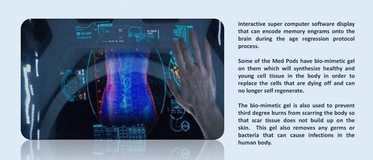 年齢回帰プロトコル・プロセス中に脳にメモリエングラムをエンコードできるインタラクティブなスーパーコンピューター・ソフトウェア・ディスプレイ。 一部のメッドポッドには生体模倣ゲルがあり、体内の健康で若い細胞組織を合成して、死につつある細胞や自己再生できない細胞を置き換えます。