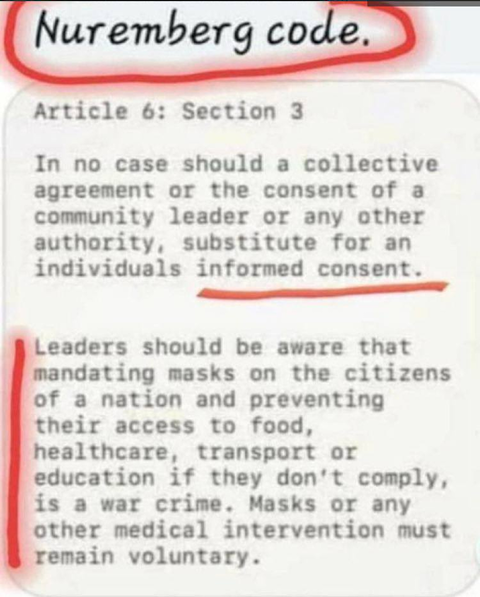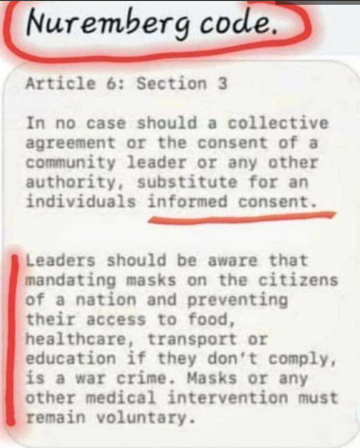 指導者は、国民にマスクを義務付け、彼らが食料や医療にアクセスできないようにすることは戦争犯罪であることを認識しておく必要があります。 マスクまたはその他の医学的介入は、自発的なものでなければなりません。