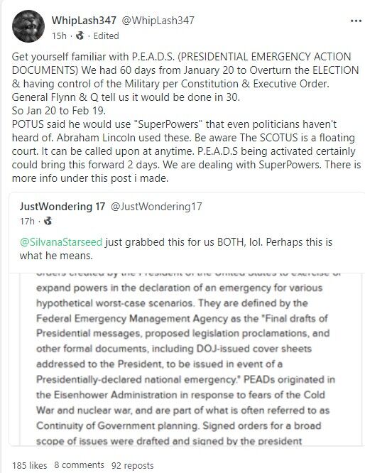 P.E.A.D.S(大統領緊急行動文書)に慣れてください。1月20日から選挙を覆し、憲法および大統領命令に従って軍隊を管理するまでの60日間がありました。 フリン将軍とQは、30年で完了すると言っています。