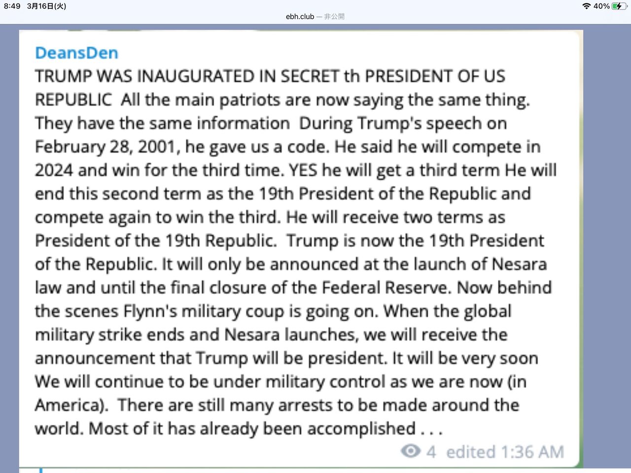 トランプは秘密裏に米国共和国大統領に就任しました。すべての主要な愛国者は今同じことを言っています。彼らは同じ情報を持っています。2021年2月28日のトランプの演説中に彼は私たちにコードを与えました、彼は2014年に競争すると言いましたそして3度目の勝利。 はい、彼は第3期を取得します。彼は共和国の第19代大統領としてこの第2期を終了し、第3期を勝ち取るために再び競争します。 彼は第19共和国の大統領として2つの任期を受け取ります。 トランプは今共和国の第19代大統領です、それはネサラ法の開始時と連邦準備制度の最終的な閉鎖までのみ発表されます。 現在、舞台裏でフリンの軍事クーデターが起こっています。 世界的な軍事攻撃が終わり、ネサラが発足すると、トランプが大統領になるという発表があります。 間もなくです。私たちは現在(アメリカ)のように軍事的統制下にあり続けます。 世界中でまだ多くの逮捕が行われています。 そのほとんどはすでに達成されています...