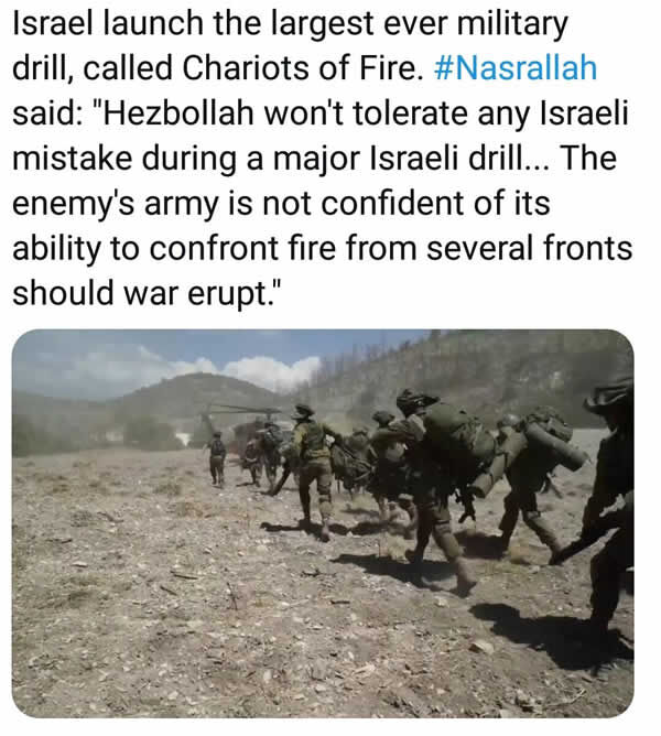 #Nasrallahは次のように述べています。「ヒズボラはイスラエルの大規模な訓練中にイスラエルの過ちを容認しません...敵の軍隊は、戦争が勃発した場合にいくつかの正面からの火に立ち向かう能力に自信がありません。」