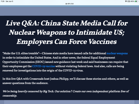 「米国エリートを震え上がらせる」ー 中国国営メディアは、米国を威するため、核兵器の追加を呼びかけている。 また、他のニュースとして、連邦雇用機会均等委員会(EEOC)は先週、新しいガイダンスを発行し、企業は従業員に連邦法に違反することなくCOVID-19ワクチンを接種することを要求できると述べた。また、COVID-19 ウイルスの起源の調査のための呼びかけが更新されています。