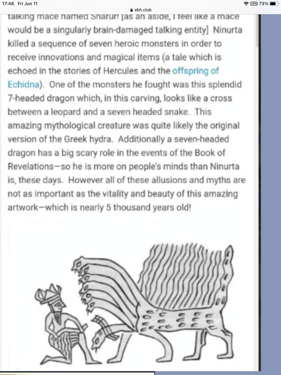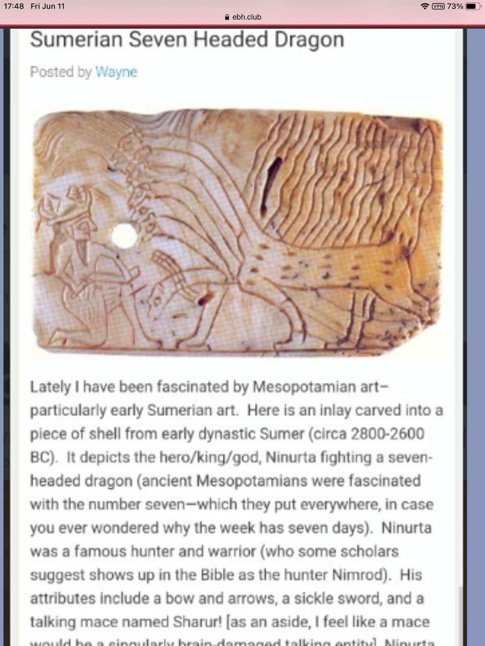 最近、私はメソポタミアの芸術、特に初期のシュメールの芸術に魅了されました。これは王朝のシュメール(紀元前2800年から2600年頃)の貝殻に刻まれた象眼細工です。それは英雄/王/神、ニヌルタが七頭のドラゴンと戦っているところを描いています(古代メソポタミア人は、週が7日である理由をあなたがした場合に備えて、彼らがいたるところに置いた数字7に魅了されました)。ニヌルタは絶賛されたハンター戦士でした(一部の学者は、ハンター・ニムロッドとして聖書に登場することを示唆しています)。彼の属性には、弓矢、鎌の剣、シャルルという名前の話すメイスが含まれます![余談ですが、メイスは脳に損傷を与えた単一の会話のエンティティのように感じます]ニヌルタは革新と魔法のアイテムを受け取るために7つの英雄的なモンスターのシーケンスを殺しました(ヘラクレスとエキドナの子孫の物語に反映されている物語)彼が戦ったモンスターの1つは、この彫刻ではヒョウと7つのヘビとの交配のように見える。この驚くべき神話上の生き物は、おそらくギリシャのヒュドラーのオリジナルバージョンでした。さらに、七つの頭を持つドラゴンは、黙示録の出来事で大きな恐ろしい役割を果たしています - そのため、最近のニヌルタよりも人々の心をとらえています。しかし、これらのほのめかしと神話のすべては、この驚くべきアートワークの活力と美しさほど重要ではありません-それはほぼ5000年前のものです!