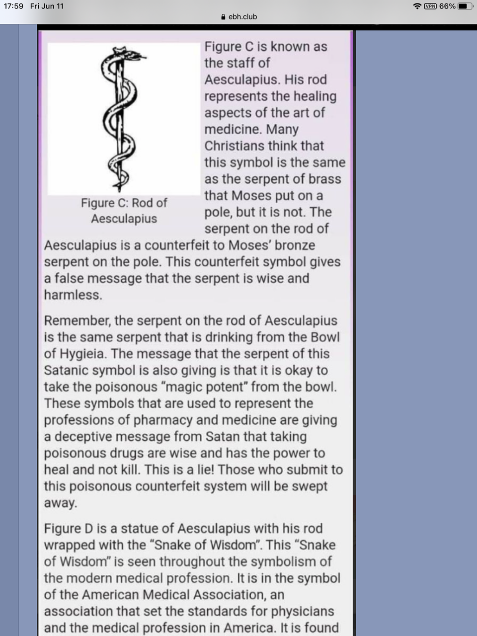 図Cはアスクレピオスの杖として知られています。彼のロッドは、医学の芸術の癒しの側面を表しています。多くのクリスチャンは、このシンボルはモーセが柱に置いた真鍮の蛇と同じであると考えていますが、そうではありません。アスクレピオスの杖の蛇はモーセの偽物です)ポールの青銅の蛇。この偽造のシンボルは、蛇が賢明で無害であるという誤ったメッセージを与えます。