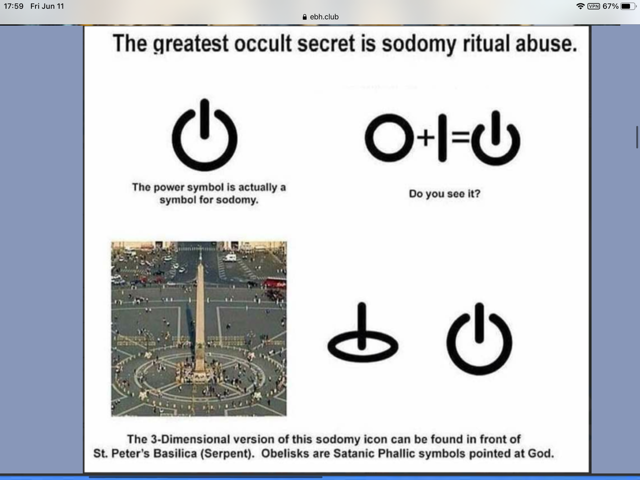 このソドミーアイコンの3次元バージョンは、サンピエトロ大聖堂(蛇)の前にあります。 オベリスクは、神に向けられた悪魔の男根のシンボルです。