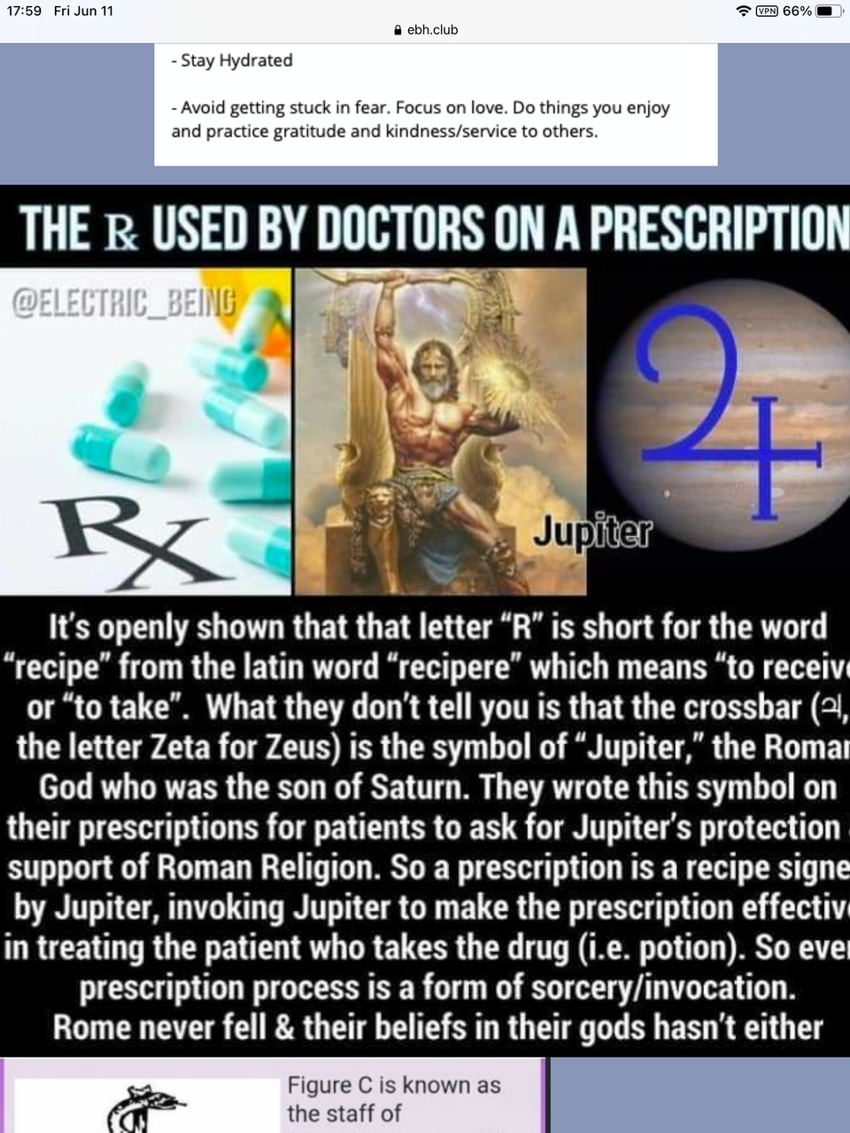 文字「R」はラテン語の「レシピ」の「レシピ」の略で、「受け取る」または「取る」を意味することが公然と示されています。 彼らがあなたに言っていないのは、クロスバー(ゼウスのゼータの文字)は、土星の息子であったローマの神「ジュピター」のシンボルであるということです。 彼らは、患者が木星の精神とローマの宗教の支持を求めるための処方箋にこのシンボルを書きました。 したがって、処方箋はジュピター (Jupiter)によって署名されたレシピであり、ジュピター を呼び出して、薬(つまりポーション)を服用する患者の治療に効果的な処方箋を作成します。したがって、すべての処方箋は魔術/呼び出しからのものです。