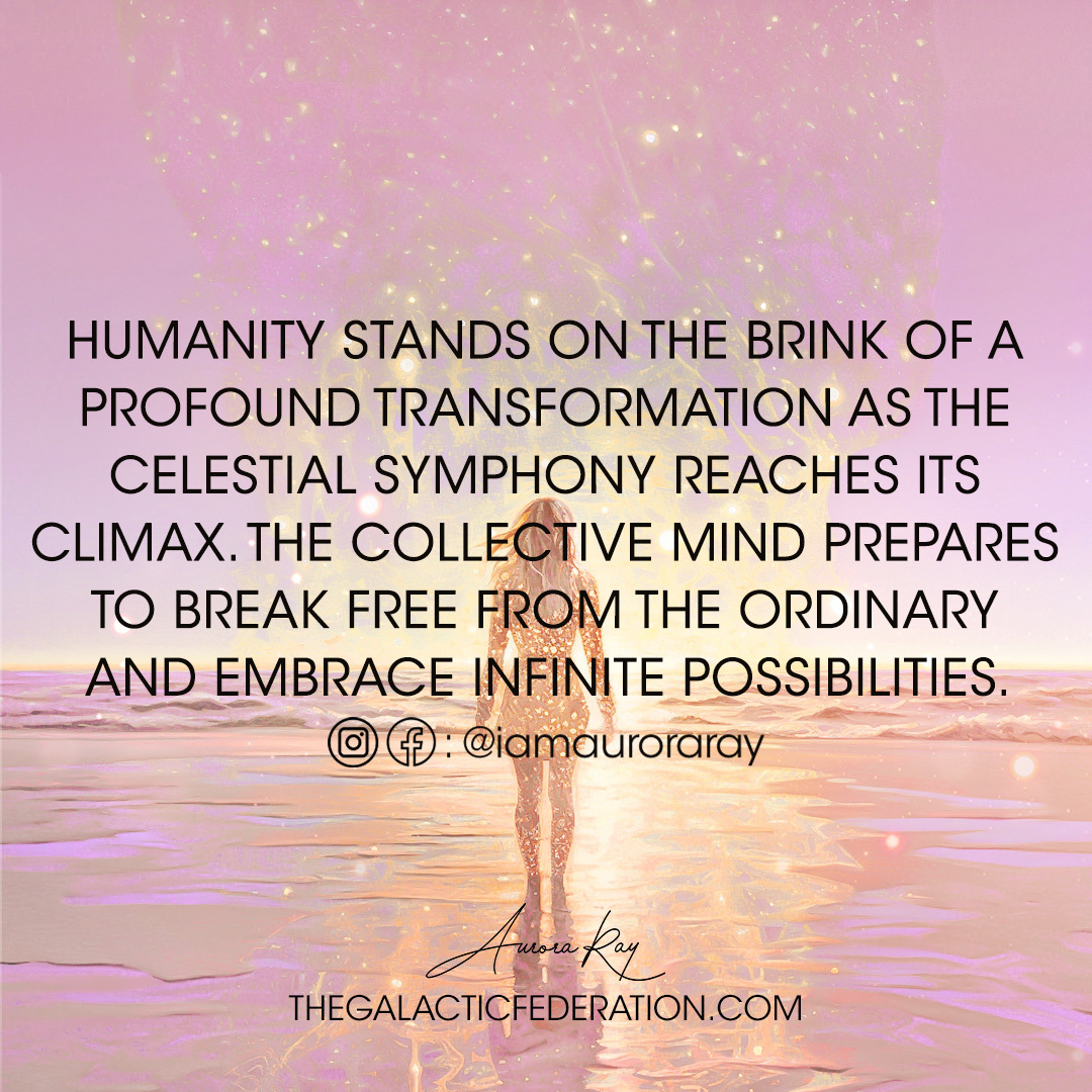 天上の交響曲が最高潮に達するにつれ、人類は重大な変革の瀬戸際に立たされています。集合的な心は日常から解放され、無限の可能性を受け入れる準備をします。