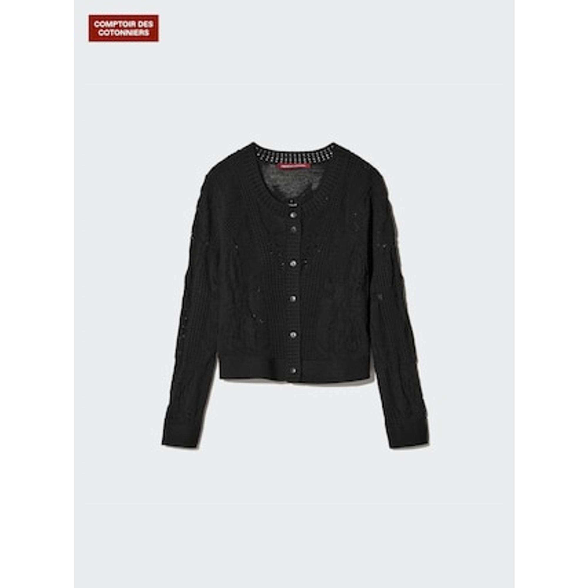 ユニクロのクロシェカーディガンは、繊細な編み柄が魅力のトレンドアイテム。