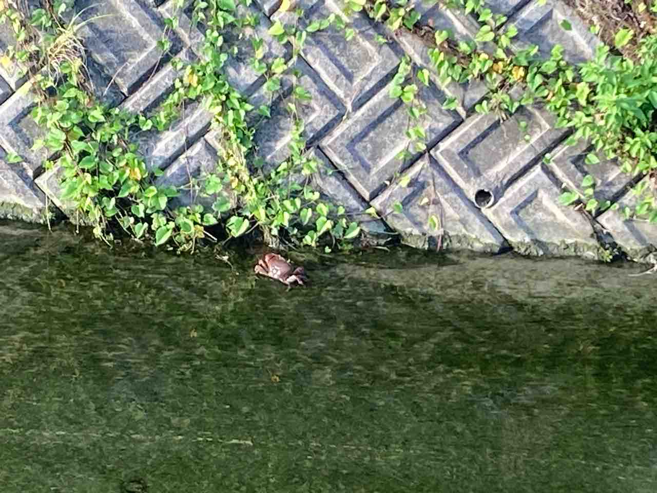 8月の帰省の間も朝から太陽の日差しが強く暑かったので家の中でストレッチとラジオ体操ぐらいにしておいた。そうそうこの時にYoutubeでラジオ体操第3を知って、1〜3までやっていた。それはさておき、久しぶりにウォーキングに出掛けていつもの道を歩いた。最後に歩いた時よりも草はぼうぼう、枝も伸びて垂れ下がっていた。よそ見をして歩いていると、枝に頭をぶつけた。危ない危ない。先も足元もよく見て歩かないと…。6月に大きな鰻を見つけた用水路に差し掛かった。草ぼうぼうなので見にくいが、ここでまた発見❗️大きなカニを発見。サワガニだったらめちゃ大きいのだが…何ガニだろう?『オキナワオオサワガニ…そのまんまやん…というらしい。