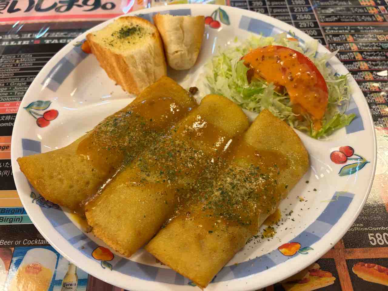 さて『エンチラーダ』は、タコスのシェルでミートとチーズ、ポテトを巻いて揚げ焼きし、ソースをかけたもの。これが3つにタコス用のレタスのサラダ、ガーリックトーストが2かけらついていました。材料はタコスとほぼ変わり無いのですが、私はタコスより『エンチラーダ』の方が好きです。何のソースかは分かりませんが、タコスのスパイシーなソースと違って、このソースが美味しいのです。タコス3つと値段も変わらないので、次回も『エンチラーダ』に決まりです。ちなみに、他のお客は、タコスとタコライスみたいなチャーリーライスのセットを注文していました。