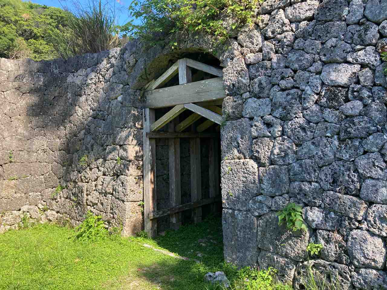 『東御廻り』の続きに出かけた。⑦は『斎場御嶽』だけど、現在工事中なので、⑧から回ることにした。『知念城』は、知念按司の住まいであったとされている。『中城』の様に門のアーチ型が特徴で、違うのは造りがアーチ状の石を何枚も重ねて厚みを出している。だから、今は石が落ちてこないように補強されていて、私たちも実際に門をくぐることができる。また、ここからの眺めは素晴らしい。沖縄の城は、高台に石垣を積んで、海を眺められる所に作られている。この『知念城』も同じく海を行く外国船を見つけると、狼煙を上げて首里城や周りの城に知らせたのであろう。『知念城』は古く、現状はそれほど良くないが、なぜかヨーロッパを思わせる。アーチ型の門といい、何か惹かれる。「知念城の門」2025.11.23