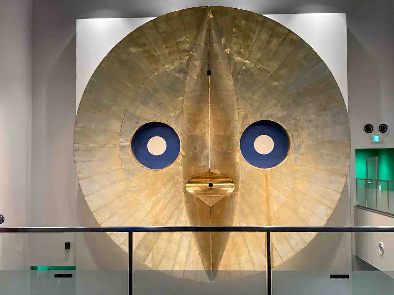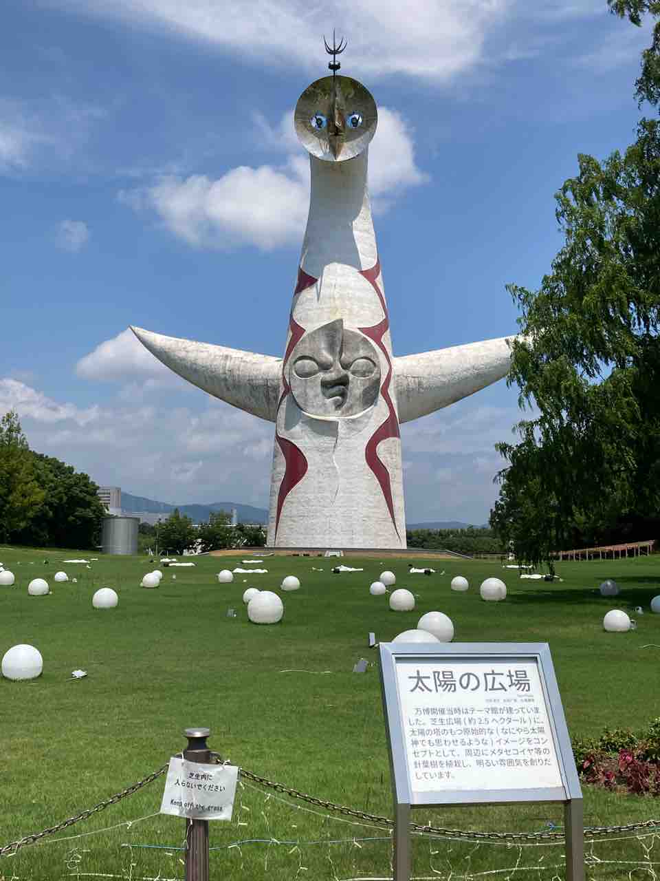 展示物の中でも1番の見物は『太陽の塔』のてっぺんに輝く『黄金の顔』1代目です。塔全体を見るとそれほど大きく見えないのですが、近くにみるとめちゃ大きくてびっくり‼️銅板を継ぎ接ぎし、錆びない様に塩化ビニールで覆われていたそうです。