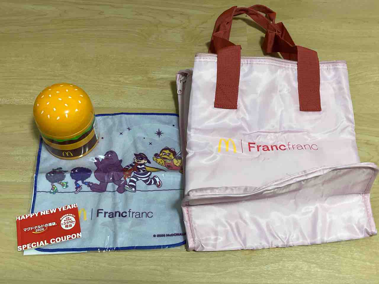 福袋は、昔たまーに買っていましたが、最近は買っていません。特に抽選の福袋に興味をもち、ここ3年ぐらいは、マックとケンタッキーに絞って応募していましたが、いつも落選でした。今年も落選かな〜って思いつつ、結果を見てみました。ケンタッキー…落選。マック…当選。えっ?当選した…取りに行かないといけない。3900円払わないといけない。でも、嬉しい❗️やっと当たった❗️1月1日、実家に近いマックへ取りに行きました。中身は、スープジャー、ピンクの保冷バック、紫のハンドタオル、商品無料券3910円分。金のマックカードは残念ながら入っていませんでした。お昼は福袋の無料券を使って『サムライマックバーガー』『フィッシュバーガー』『ポテトL』『ナゲット』を購入。当選、嬉しい❗️特にマックの福袋は、福袋の値段より10円分上回る商品無料券がついているし、入っているアイテムもハンドタオル以外は全部使えるものばかり…これで、弁当にスープや味噌汁も持っていけます。買い物の時はもちろん、離島へ旅行に行く時にも保冷バックに凍らせた飲み物やパンやお菓子などを入れて持っていけます。来年は何がついてくるんだろう?「マクドナルドの福袋」2026.1.4