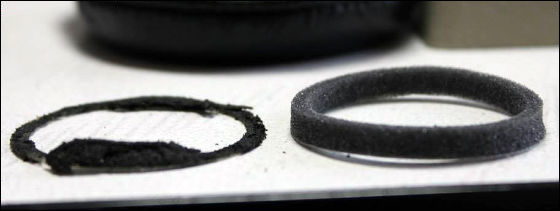 固定リングに貼り付けられているウレタンリングのビフォー・アフター。左が取り外した使用済みで、右が交換用に調達した新品。約3年にわたって使用するだけで、こんなにヘタっていました。