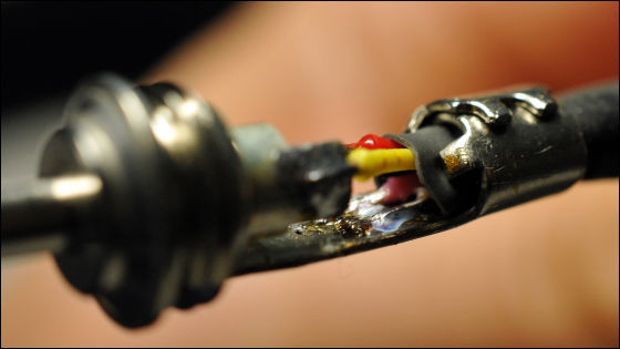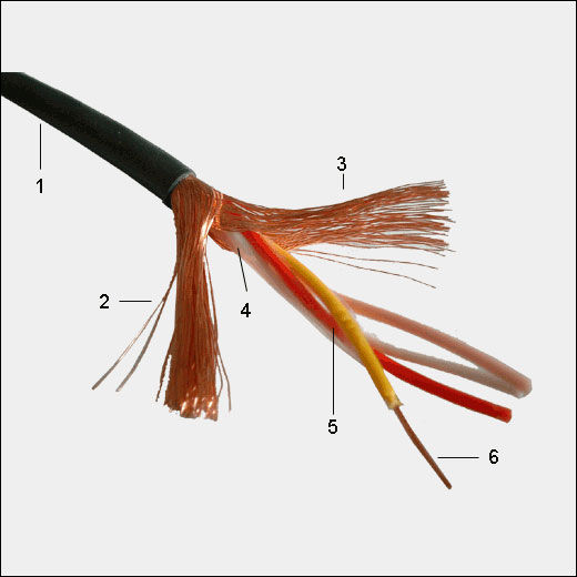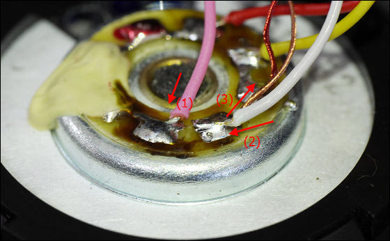 ケーブル内部はこんな感じ。赤、白、黄、ピンクの4本のケーブルに加え、この細さでノイズを防ぐシールド(図中2,3)が装備されているのが特徴です。(ただし、今回の改造では使用しません)