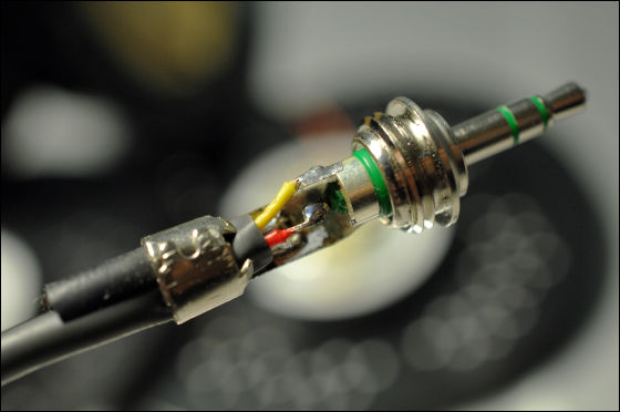 プラグ側も加工が必要です。黄色いケーブルがR側、赤いケーブルがL側となっています。今回はiPodなどの再生にも使いやすい3.5mmミニジャックに換装してみました。