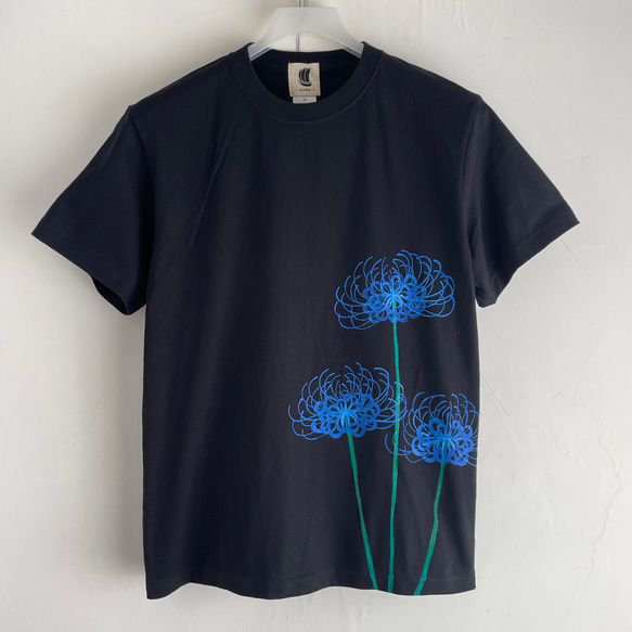 左裾から青い花弁の彼岸花を三輪、後ろ裾に二輪描いています、シンプルながらも手描き独特の個性的なオリエンタルでモダン和風なデザインのTシャツは大人っぽく男性でも女性でも合わせられるデザインに仕上がっています。