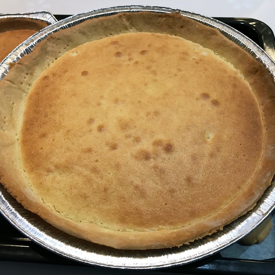 めん棒で伸ばし型にしく。フォークでぷつぷつ穴を開け、160度にあたためたオーブンで10分くらい焼く。
