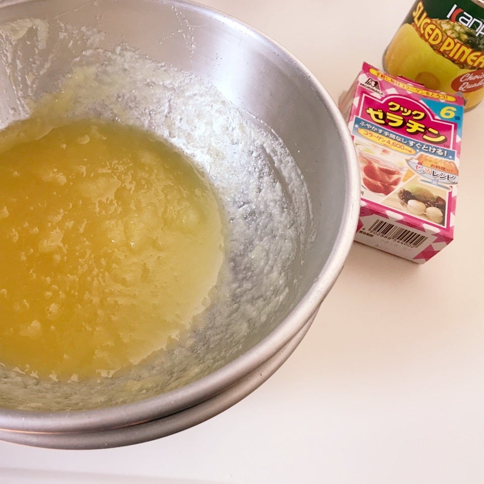 同様に缶の汁を温めて、ゼラチンを溶かし、溶けたらボールにうつす。