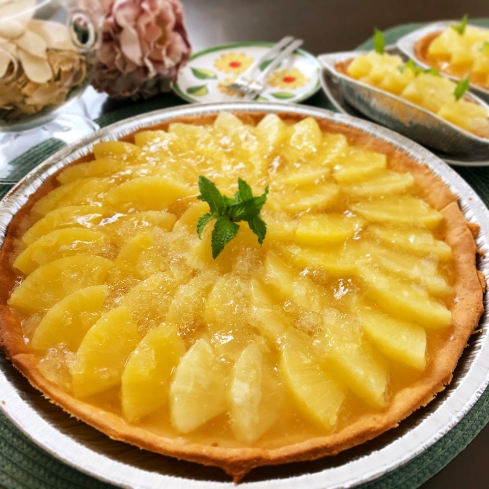 タルト生地は面倒なので寝かせず、焼いたら一晩冷蔵庫に置いてしっとりさせてから、パイナップルのせました。