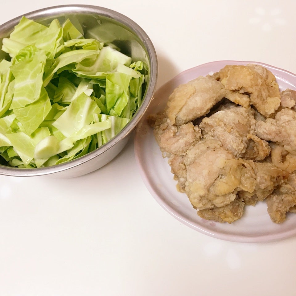キャベツは外側の部分使用。一口サイズにカット。唐揚げは一度、レンジで温めておきます。