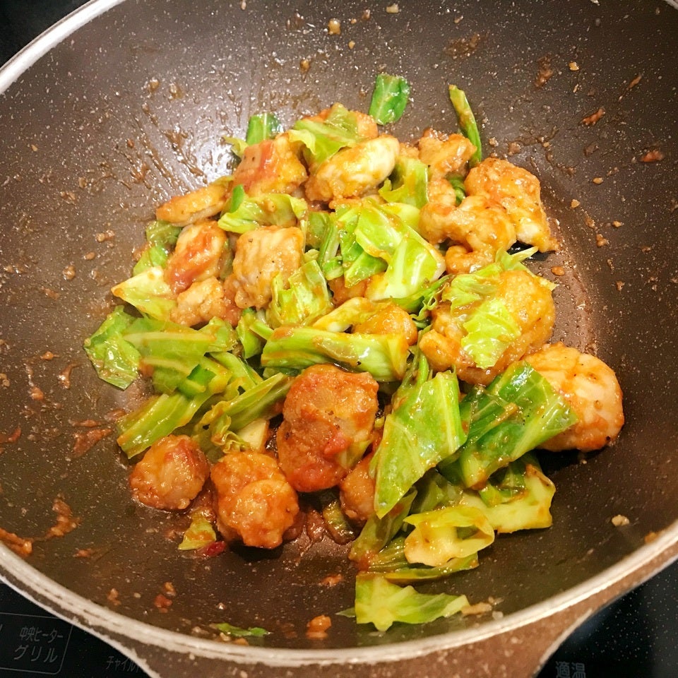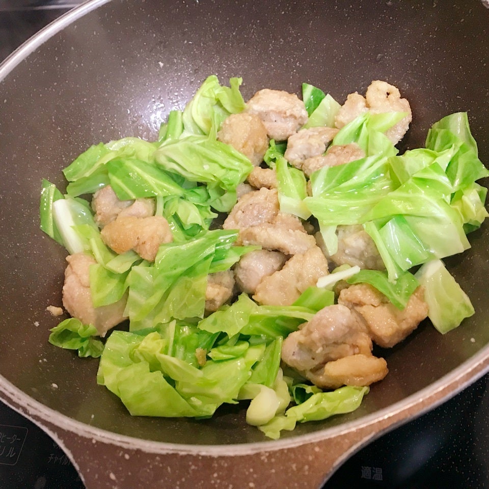 中火でキャベツを軽く炒め、唐揚げを入れます。
