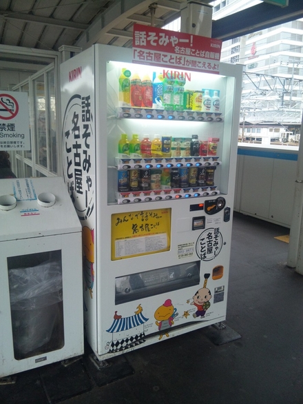 写真は名古屋出張のおり、名古屋駅で見かけた名古屋弁を喋る自動販売機です。